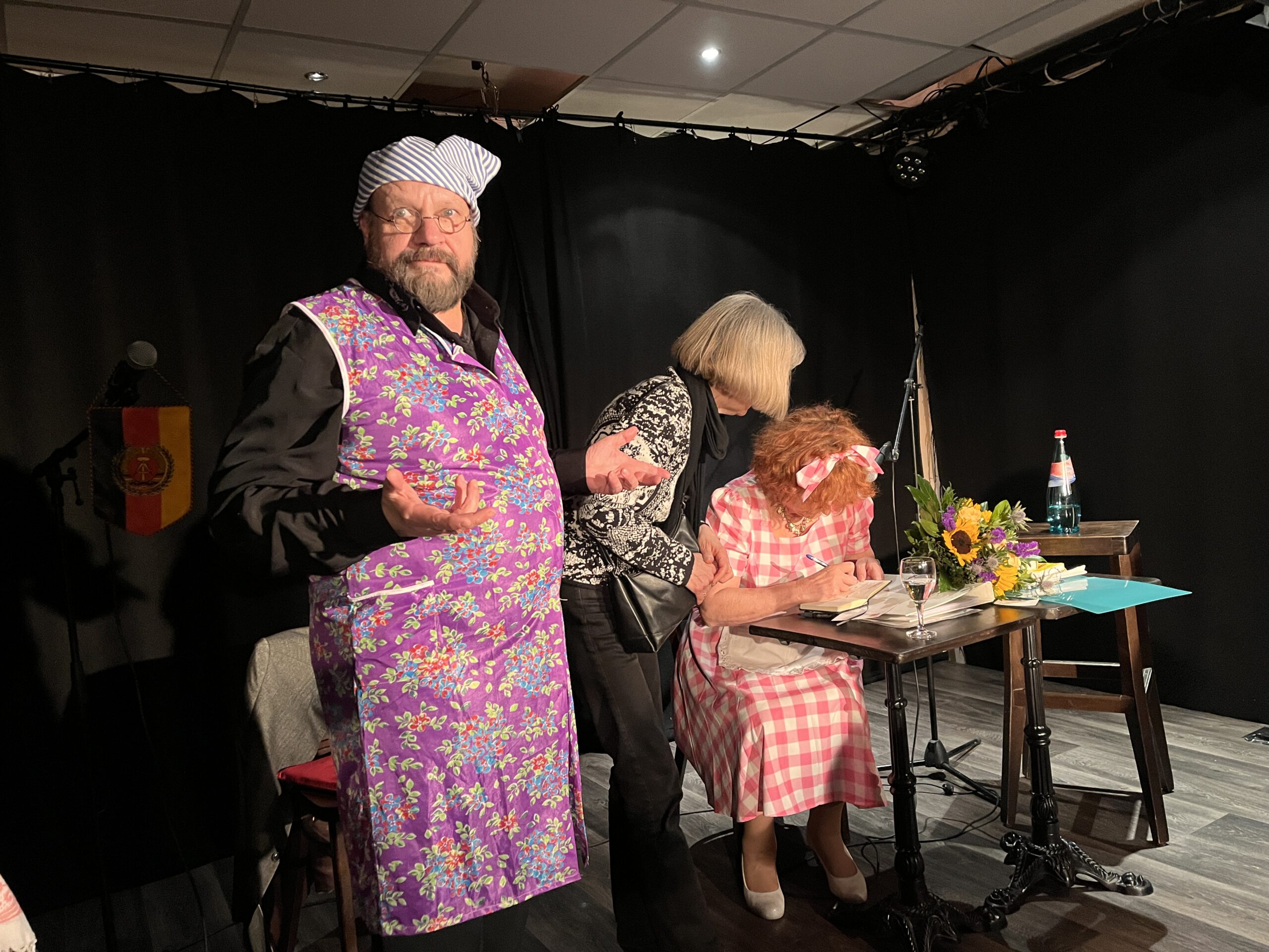 Die Kabarettistin, Sängerin und Regisseurin wurde durch die Zusammenarbeit mit Helga Hahnemann zur DDR-Show-Legende. Jetzt hat sie ihr drittes Kochbuch veröffentlich „Ostsüppchen bleibt Ostsüppchen 3.0“, das sie uns präsentiert. Dort sei das Kochen eher Nebensache, verrät sie. Im Vordergrund stünden die Geschichten und Plaudereien beim gemeinsamen Brutzeln mit anderen DDR-Berühmtheiten, denen je ein Rezept gewidmet sei. Von Inka Bause, die im Publikum anwesende Uschi Brüning, Dirk Zöllner, Frau Puppendoktor Pille (Urte Blankenstein) bis Uwe Hassbecker von Silly nebst „Maschine“ von den Puhdys u.v.a..